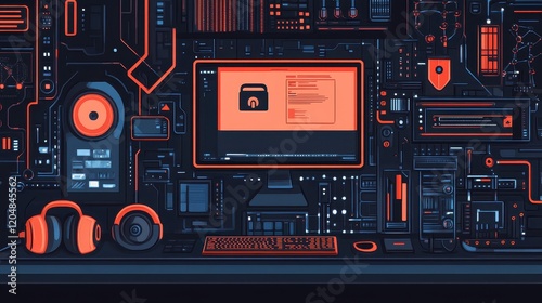 Secure digital technology flat design side view corporate theme cartoon drawing Complementary Color Scheme