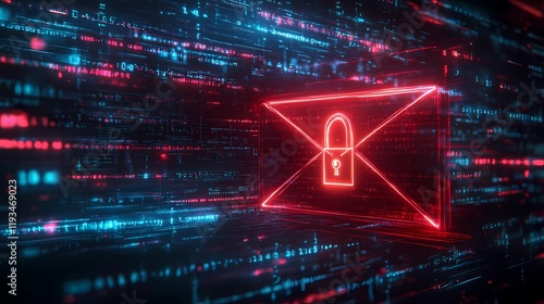Secure email communication with encrypted data transfer and cybersecurity protection concept, digital lock symbol over email icon, book illustration style