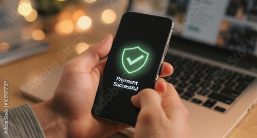 Secure Mobile Payment Confirmation Hand Holding Smartphone with Success Message and Checkmark