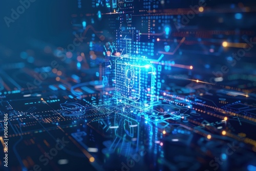 Securing Cyber Space Blue background with digital data protection locker symbolizing cyber security technology