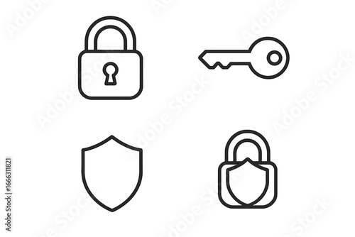 Security and Access Outline Icon Set of 4 – Lock, Key, Shield, Protection Symbols. Vector Illustration on Transparent Background for Cybersecurity and Data Protection Concepts