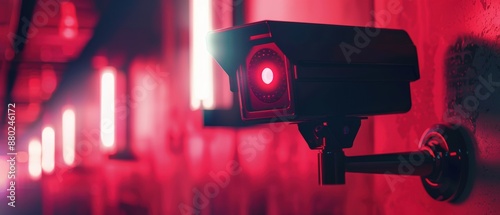 Security camera with infrared night vision, capturing a clear image in the dark, red and black hues, Tech-focused, 3D render