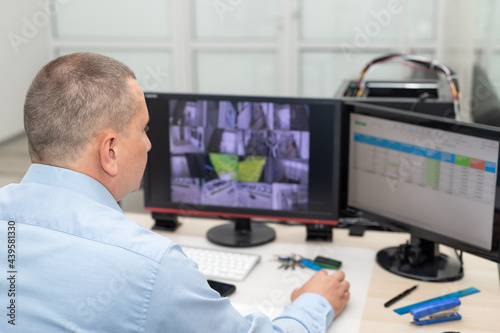 Security guard monitoring CCTV cameras in security room. Surveillance, modern technology concept. selective focus