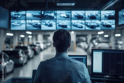 Security personnel monitoring a parking garage's CCTV feeds on multiple screens.