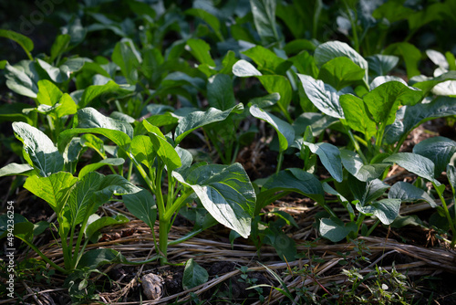 Seedlings of green leafy vegetables in the vegetable plot