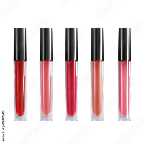 Selection of lip gloss tubes, glossy and sleek design, isolated transparent background.