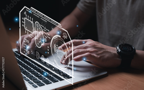 Selective focus at human hand while type or input a command to navigate chatbot or AI to get answer or information from big database. Artificial intelligence that can provide SEO or business info