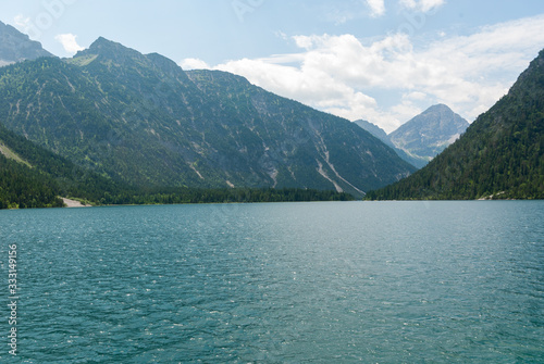 selective focus, blue lake with mountains