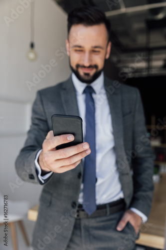 selective focus of smiling businessman holding smartphone in hand