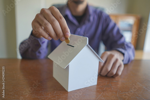 Selective focus of young man inserting gold coin into saving box as buying house concept