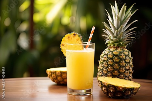 Selective focus on a glass of pineapple juice with a straw a piece of pineapple and another pineapple nearby