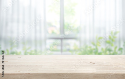 Selective focus.Wood table counter on blur curtain window in fresh morning background.copy space