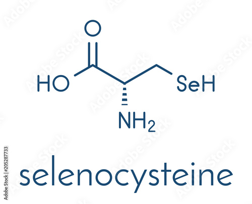 Selenocysteine (Sec, U) amino acid molecule. Called the 21st proteinogenic amino acid, present in selenoproteins. Skeletal formula.