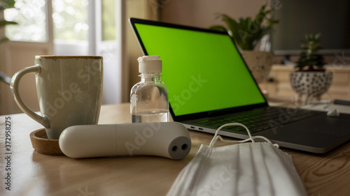 Self-isolation work from home. Medical mask on notebook laptop computer home working station. Protection mask anti virus corona ncov for safety quarantine