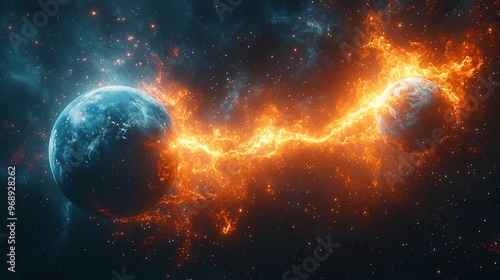 Semiabstract cosmic bridge connecting two planets with glowing energy flowing between them symbolizing connection and unity