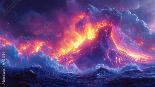 Semiabstract illustration of a volcano erupting with molten lava and ash forming dynamic glowing neon patterns symbolizing the power of Earths geological processes
