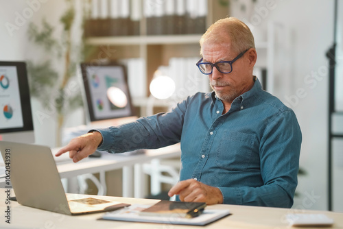 Senior business manager pointing at laptop screen while reviewing financial data during online meeting in modern office
