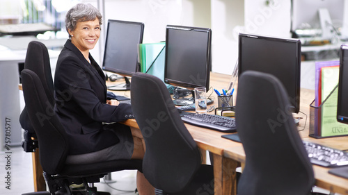 Senior, business woman and portrait with computer at agency for communication or networking at office. Mature female person, agent or employee with smile on desktop PC for customer service or support