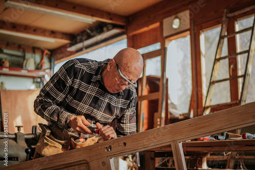 Senior carpenter using chisel in workshop