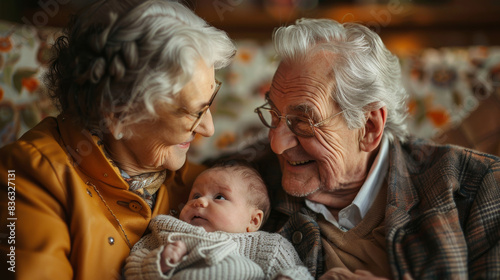 Senior Couple Holding Newborn Baby in a Warm, Cozy Living Room. Generative ai