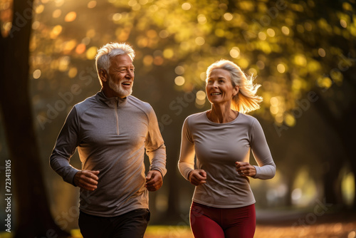 Senior couple jogging in a park at dawn, showcasing active lifestyle in later years. Concept of health and vitality in aging. Generative Ai.