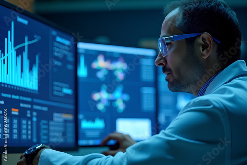 Senior Doctor in Glasses Examining a Scientific Experiment Report on a Big Screen. PhD Professor Looking at the Screen, Analyzing Provided Data and Technical Information. Biochemistry Concept