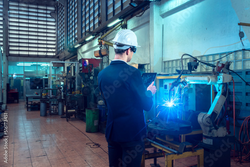 senior engineer In progress to control the robotic arm to do the welding of the workpiece. with resolution and high accuracy requirements by tablet to obtain workpieces used in the automotive industry