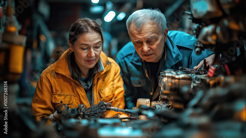 Senior Engineers Working Together on Machinery in Industrial Workshop