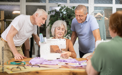 Senior female teacher demonstrates technique and algorithm of sewing with machine, shares skills with elderly students. Students listen, watch, and learn from experience..