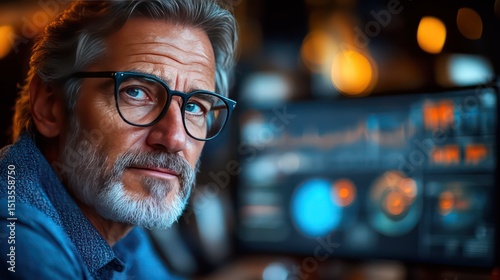 Senior financial advisor at modern desk with multiple monitors, reviewing documents and using calculator.