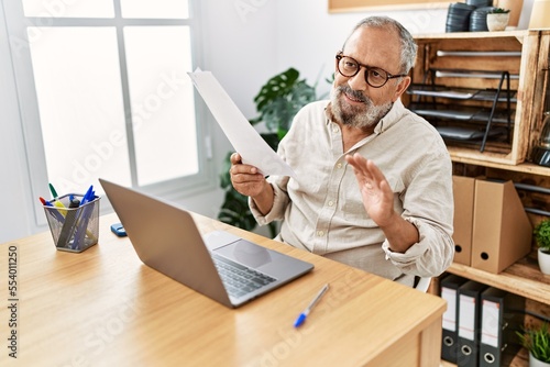 Senior grey-haired man smiling confident working at office