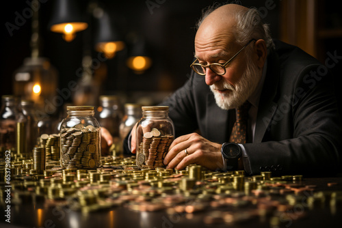 Senior man counting coins in a glass jar on a dark background.