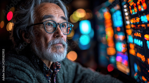 Senior man focused on computer screen filled with data and graphs in a dimly lit room during the evening hours. Generative AI