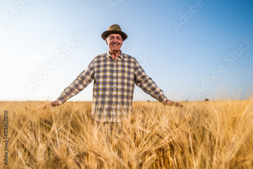 Senior man is standing in his growing wheat field. Farmer is satisfied with growth of crops.
