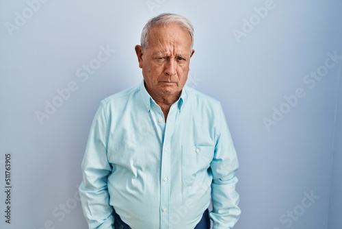 Senior man with grey hair standing over blue background depressed and worry for distress, crying angry and afraid. sad expression.