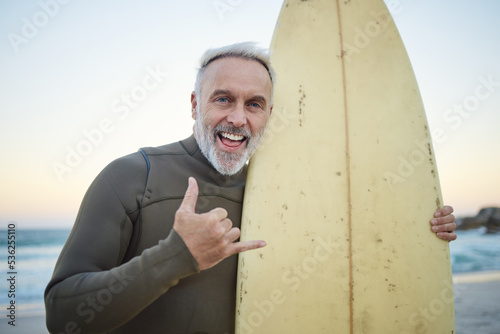 Senior man, with surfboard and at beach smile, happy and at sunset with swimwear on a holiday and vacation. Portrait, shaka and older male surfer, hand sign and at seaside surfing while on a trip.