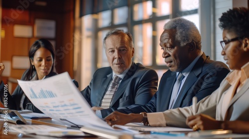 Senior managers reviewing competitive analysis reports, discussing market positioning and strategies in a formal boardroom