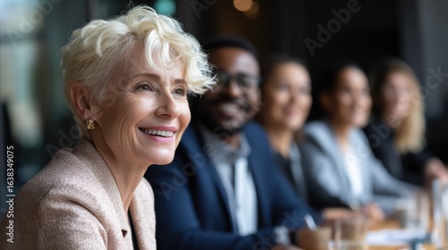 senior older female executive ceo and happy multicultural business people discuss corporate project at boardroom table smiling diverse corporate team working together in modern meeting room office no