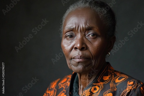 Senior woman in traditional attire poses thoughtfully against a dark background in a serene setting