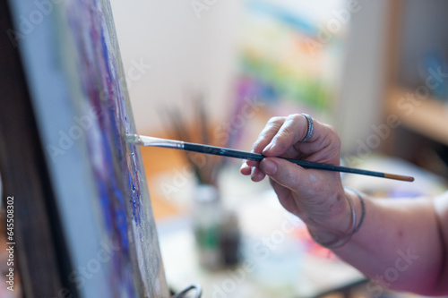 Senior woman's hands using a brush painting an oil painting with out of focus background