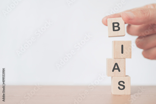 senior's hand arranged wooden cube blocks with the word Bias including copy space, prejudice. Personal opinions, Preconception concept