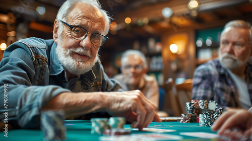 Seniors' poker game, friendly atmosphere, clear backdrop,