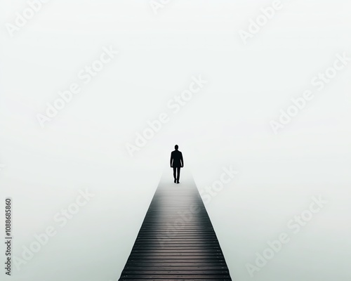 sensitive sadness concept. A lone figure stands on a wooden pier, surrounded by a serene fog, evoking a sense of solitude and contemplation.