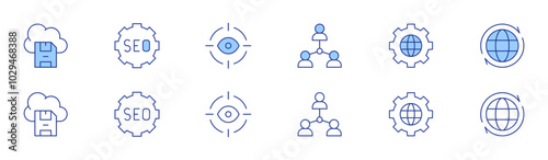 Seo icon set in two styles, Duotone and Thin Line style. Editable stroke. save file, seo, people, globe, global, eye