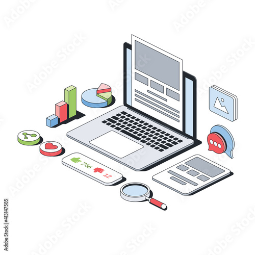 SEO marketing, website design, social network promotion. Vector 3d line isometric, color web icons, new flat style. Creative illustration, design idea for infographics.