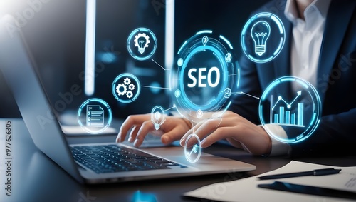 SEO, Search engine optimization, Businessman uses a laptop to analyze SEO, Website ranking, Search engine ranking