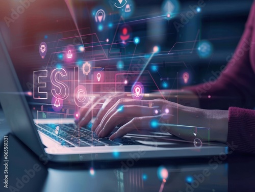 SEO Search Engine Optimization. Woman typing on laptop computer keyboard searching the information internet browsing. Web page banner data search technology
