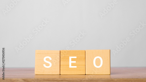 SEO word written on wooden blocks on a wooden table with a light gray background. Digital marketing and optimization concept