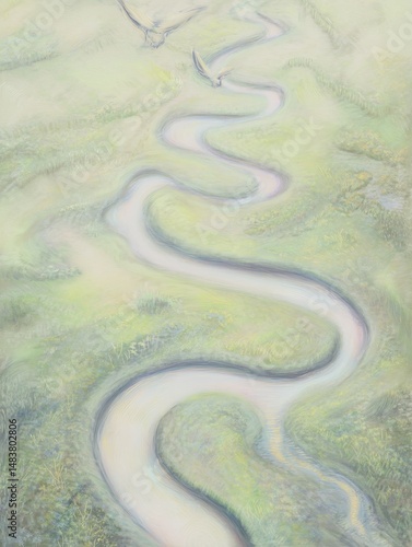 Serene Aerial View of a Winding River Flowing Through Lush Green Landscapes with Soft Textures and Muted Tones Under a Gentle Sky