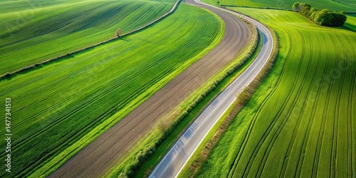 Serene Aerial View of a Winding Road Through Lush Green Agricultural Fields